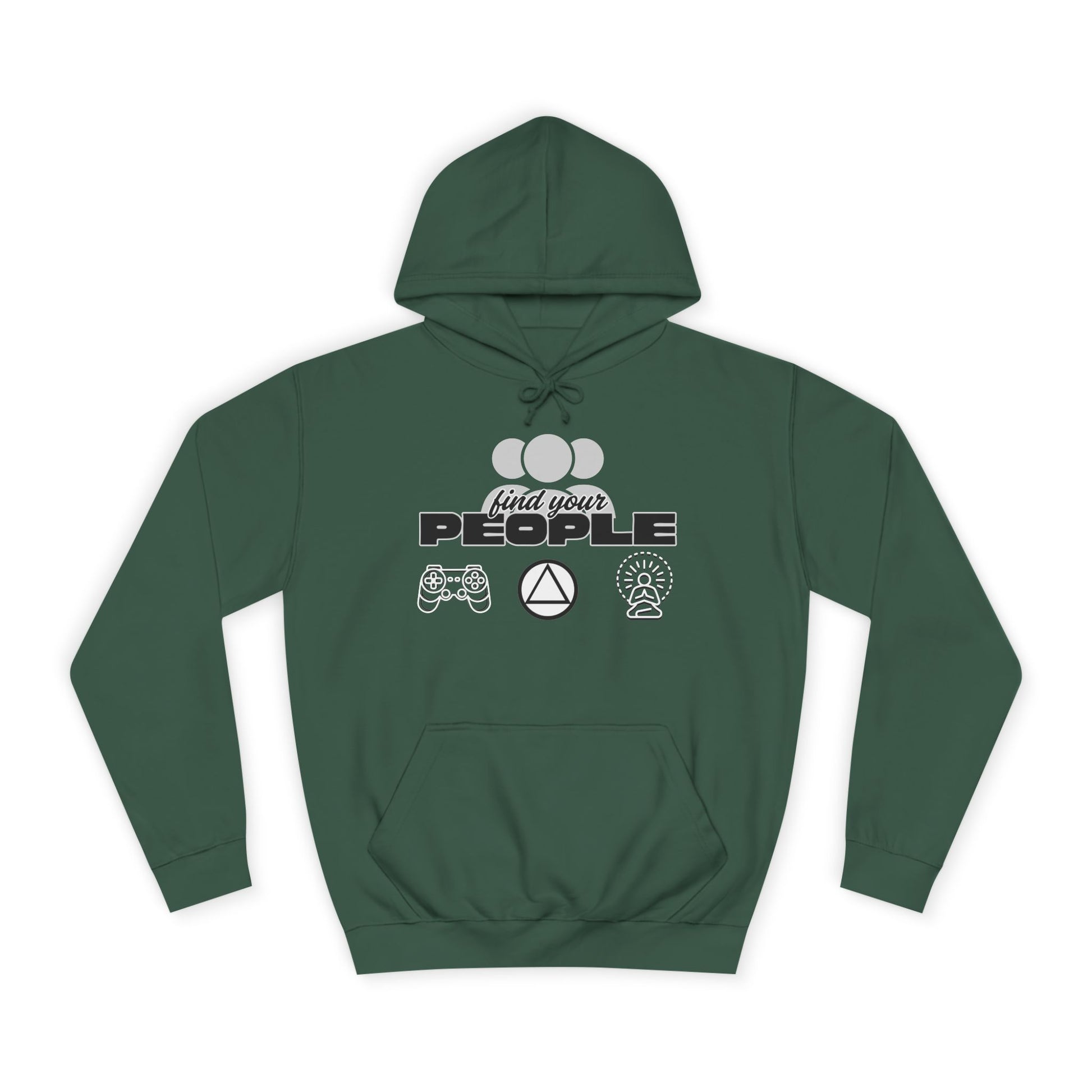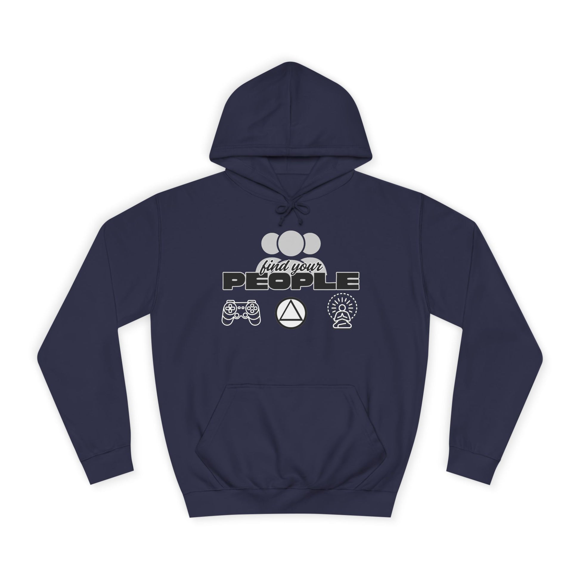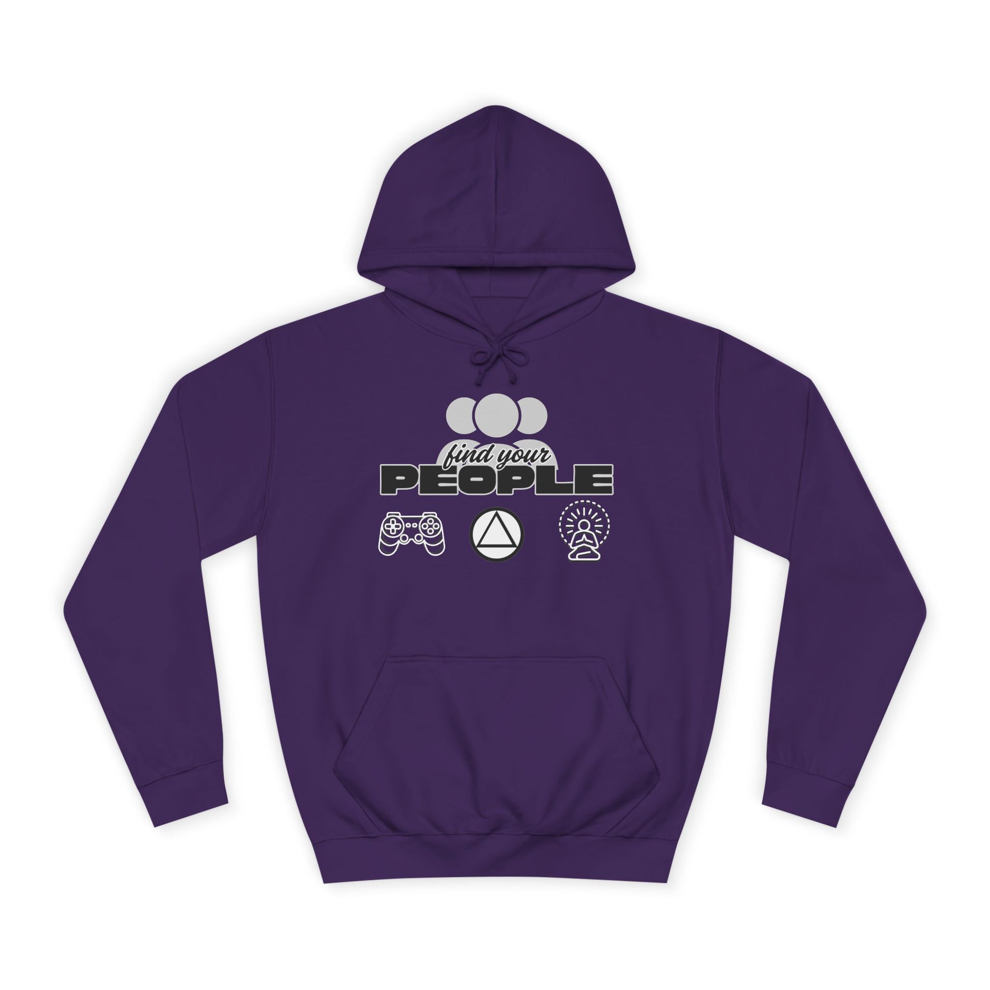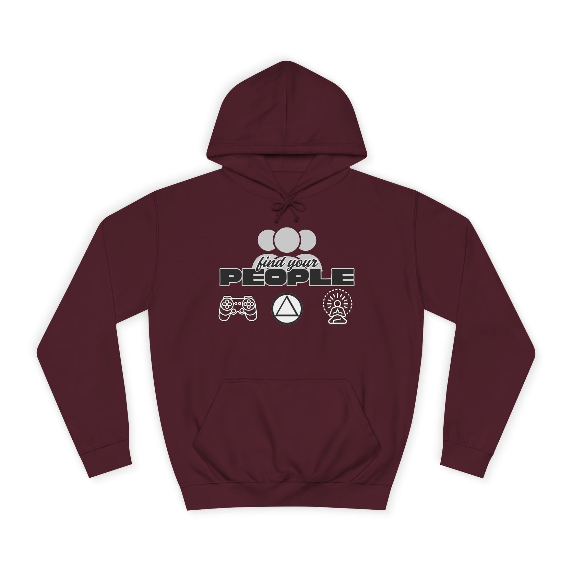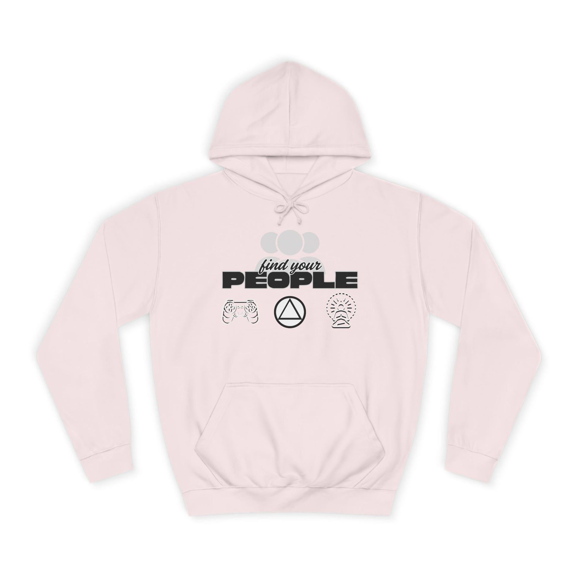 A cozy unisex college hoodie with a 'Find Your People' design, perfect for those who value friendship and community. This hoodie gives off a warm and inviting vibe, ideal for casual hangouts and gatherings with loved ones. Relevant for holidays, birthdays, or just everyday wear.