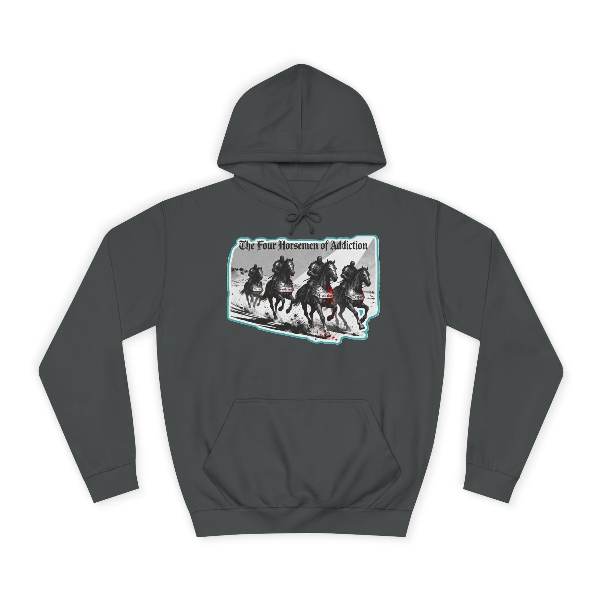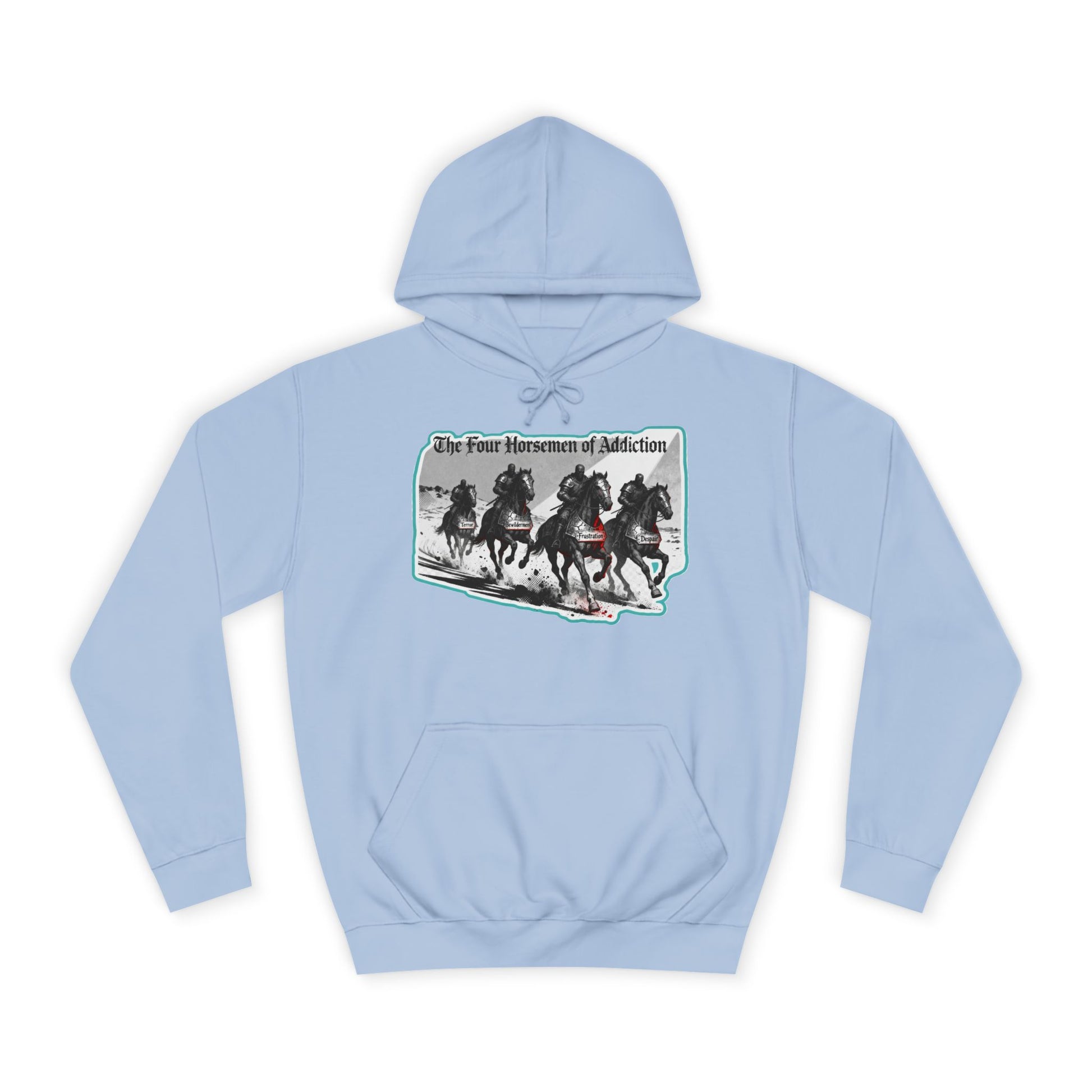 A cozy and comfortable unisex college hoodie featuring the mantra 'Four Horsemen of Addiction' from the Recovery Collection. This hoodie exudes positivity and motivation, making it perfect for anyone on their journey to recovery. Great for everyday wear or as a reminder of staying focused on progress. Ideal for those celebrating recovery milestones or those supporting loved ones in recovery. Relevant for holidays like Sober October and National Recovery Month.