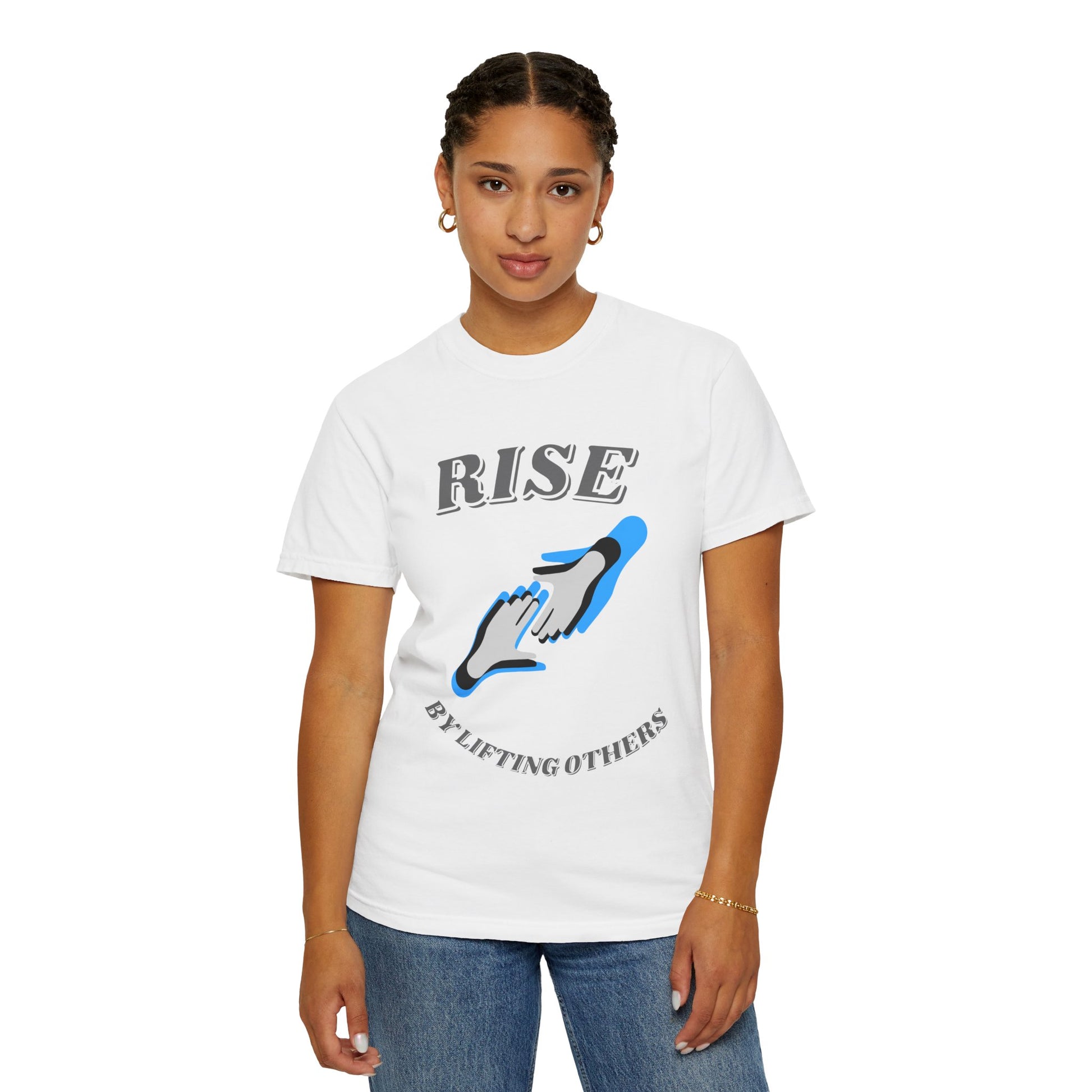 Greatness lifts those around it. This tee is your daily reminder: together, we rise higher. Wear it, support others, and be the spark that makes everyone stronger. This unisex garment-dyed T-shirt features a simple and inspiring 'Rise by Lifting Others' design. It gives off a friendly and positive vibe, making it perfect for those who value community and connection. Ideal for social gatherings, team events, and group activities.